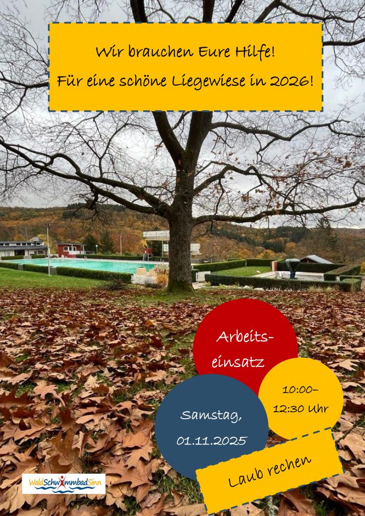 Am Samstag, 01.11.2025, benötigt das Team des Waldschwimmbads wieder die Hilfe von Vereinsmitgliedern und Freiwilligen aus der Bevölkerung, denen an einer ordentlichen Liegewiese im nächsten Sommer gelegen ist.
