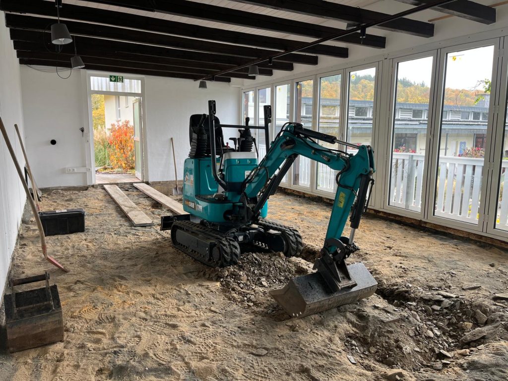Die Sanierung und Renovierung des Kiosk-Wintergartens geht weiter. Nachdem das Dach komplett erneuert wurde, muss jetzt aus energetischen Gründen der Boden saniert und kältefest gemacht werden. Nach dem Ausbaggern (das sind alles Leihgeräte!) und Isolieren wird eine Beton- und Estrichschicht aufgetragen, damit endlich ein fester und besser zu pflegender Boden verlegt werden kann. Zur nächsten Saison ist spätestens alles wieder benutzbar.